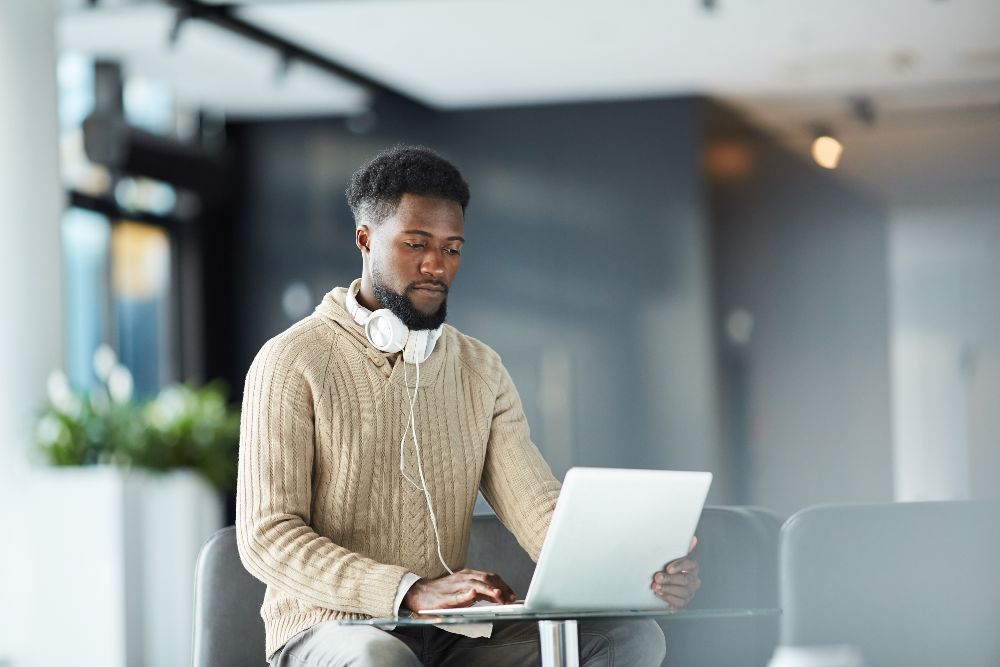 man standing in front of people sitting beside table with laptop computers
